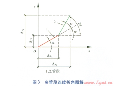 式中Dx2——管段2折角后管段在x軸上的行進距離,m