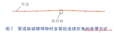 在直埋供熱管道的實際設計與施工中經常遇到設計路由上有障礙物且無法移走的情況,因此管道必須局部改變方向(包括水平面、豎直面上的方向改變),避讓障礙物,通過后還需調整回原路由。由于現場這樣的情況非常多,因此若每遇到這種情況都采用預制彎管,一方面需要增加大量的預制彎管數量,使工程造價提高;另一方面,定制預制彎管的時間很長,延長了工期,這往往是不可行的。因此,實際工程中常采用多管段連續(xù)折角的方法處理。管躲避障礙物時多管段連續(xù)折角的布置方式見圖2