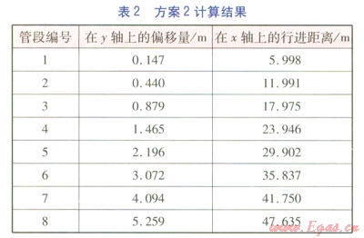 由表12可知,若實現0.879my軸上的偏移量,方案2x軸上僅行進17.975m,而方案1需行進23.982m。這說明,采取縮短管段長度的方法,有利于在較短的行進距離內實現較大的偏移量,從而順利避開障礙物。需要指出的是:在實際工程中,我們可以采取多實際折角與多管段長度相結合的處理方法,但焊縫數量不宜過多,以影響施工質量。不應出現避讓開障礙物后,管道調整回原管位時出現實際折角大于最大允許折角的情況。