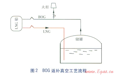 LNG船在向儲(chǔ)罐卸裝液體時(shí),由于液體流出而產(chǎn)生真空,增加了液體卸裝的阻力,極大地增加了耗能,甚至使LNG船上的液體無(wú)法完全卸入罐內(nèi)。因此,LNG接收站接收LNG時(shí),需要及時(shí)填補(bǔ)LNG船艙由于液體流出所形成的真空。如采用其他氣體返補(bǔ)真空,既會(huì)引入新的雜質(zhì),又會(huì)造成熱量大量流,加速LNG氣化。而LNG儲(chǔ)罐中產(chǎn)生的BOG溫度大約在-140150℃,將BOG通過(guò)氣體返回線流回船艙填補(bǔ)真空,可以很好地避免上述問(wèn)題。時(shí)在BOG返回船艙時(shí),船艙內(nèi)大量LNG提供的冷量使得BOG重新液化,在一定程度上回收了BOG[7]。BOG返補(bǔ)真空工藝流程見(jiàn)圖2