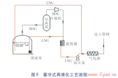 為了克服LNG外輸量小導(dǎo)致所提供的冷量不足以將BOG再液化的問(wèn)題,在以上基礎(chǔ)上發(fā)展了蓄冷式再液化工藝,流程見(jiàn)圖6。