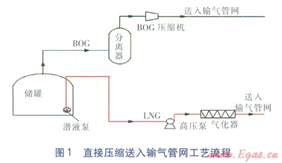 該工藝流程簡(jiǎn)單,設(shè)備少,可以節(jié)約造價(jià),因此,在實(shí)際中被較多采用,比如日本大阪瓦斯和東京瓦斯公司等的LNG接收站的BOG處理就是采用了這種方法[8]。但是這種方法能耗大,受下游用氣量影響較大,適應(yīng)性不強(qiáng),而且BOG所攜帶的大量冷能消耗于壓縮機(jī)的壓縮過(guò)程,未得到利用,造成了浪費(fèi)。