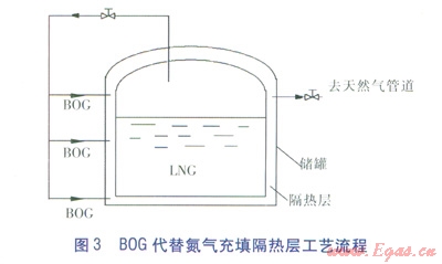 BOG氣體需要及時(shí)排出以維持儲(chǔ)罐的微正壓,一個(gè)辦法是使用BOG代替氮?dú)獬涮罡魺釋?。利?/span>BOG充填絕熱層只需在原儲(chǔ)罐基礎(chǔ)上稍加改造就可實(shí)現(xiàn),投資很少,可以省去制氮設(shè)備,經(jīng)濟(jì)高效,且熱量流入時(shí)首先會(huì)被低溫的BOG氣體吸收,儲(chǔ)罐的隔熱效果更好。俞樹(shù)榮、席家福[10]在這方面進(jìn)行了探索和論證,并對(duì)BOG充填隔熱層進(jìn)行了傳熱分析,給出了具體的計(jì)算,提出了BOG代替氮?dú)獬涮罡魺釋拥墓に嚵鞒?/span>(見(jiàn)圖3)。但是,充填隔熱層用量對(duì)于大型儲(chǔ)罐的日產(chǎn)BOG量來(lái)說(shuō)比較小,并不能從真正意義上減少BOG的排放。