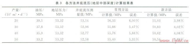 利用式(1)~(2)、(8)~(11)對普光B井的井筒壓力進(jìn)行計算,同時也利用常用的干氣井井底流壓計算公式[11]進(jìn)行計算,其計算結(jié)果如表3所示。