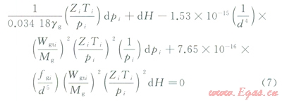 式中pi為第i段微元體內(nèi)氣體壓力,MPa;Ti為第i段微元體內(nèi)氣體溫度,K;Zi為第i段微元體內(nèi)氣體壓縮因子;fgi為第i段微元體摩擦因子;Mg為氣體摩爾質(zhì)量,g/mol,Mg=28.97gg;H為氣井的垂深,m;Wgti為第i段微元體中干氣質(zhì)量流量的總流量,Wgti=Wgmi+Wgi,kg/d。