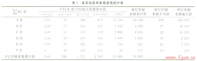 筆者定義多層地層系數(shù)累積值及多層地層系數(shù)偏差值來表示地層系數(shù)的差異性。多層地層系數(shù)累積值,即各層地層系數(shù)之和;多層地層系數(shù)偏差值,即地層系數(shù)方差值,用來衡量地層系數(shù)的波動大小,方差值越大,表明地層系數(shù)波動越大,非均質(zhì)性越強。表1為普光氣田5口井的地層系數(shù)偏差值??傮w特征為:多層分布特征,各層滲透率差異大;多數(shù)井儲層縱向非均值性強、層數(shù)多,層間地層系數(shù)差異大。累積值為: