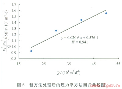 以普光B井為例來說明所建立的產(chǎn)能評價方法。首先,利用第2部分建立的井底流壓取值深度優(yōu)化方法,得出普光8井第8~11層的累積產(chǎn)能為總產(chǎn)能的1/2,即取第8層深度處的壓力為井底壓力;其次,利用第3部分的井筒壓力分布計算模型,計算出第8層的井底流壓;第三,對該井資料進(jìn)行處理,并進(jìn)行壓力平方法回歸,其結(jié)果見圖6。