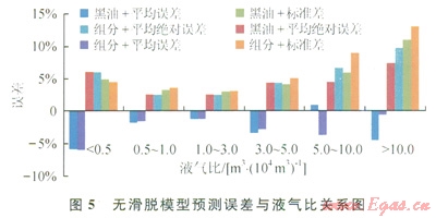 無(wú)滑脫模型各項(xiàng)誤差次之(4),組分模型計(jì)算誤差大于黑油模型,是由于Govier-Fogarasi用的凝析氣井液氣比為0.0514.4m3104m3,從黑油模型對(duì)所選模型(無(wú)滑脫、GrayHagedorn&Brown沒(méi)有劃分流型)計(jì)算流型看:Mukherjee&BrillOrkiszewski所有井井簡(jiǎn)全部為段塞流,HasanKabir預(yù)測(cè)結(jié)果除5井次出現(xiàn)分散泡狀流以外,其余井全為環(huán)狀流。段塞流為一段氣一段液,而環(huán)狀流主要靠氣相中攜帶的液滴和氣相與管壁液膜的摩擦帶液。因此兩種流型的滑脫損失均較小,可以采用無(wú)滑脫模型計(jì)算壓降。從分段液氣比看,液氣比小于0.5m3104m3,誤差較大,這主要是由于氣液比極高,舉升壓降極小,13口壓降梯度平均為1.74MPa1000m,導(dǎo)致井底流壓(13口井底流壓平均13.4MPa)較小,即使計(jì)算的井底流壓誤差較小因井底流壓測(cè)壓值較小而誤差較大。隨著液氣比的增加,各項(xiàng)誤差逐漸增加(5)?,F(xiàn)考慮各項(xiàng)誤差限為5%,采用無(wú)滑脫模型的液氣比范圍為0.55m3104m3,并對(duì)該氣液比條件下的產(chǎn)氣量進(jìn)行了分段統(tǒng)計(jì)如圖6所示,隨著產(chǎn)氣量的增加,各項(xiàng)誤差逐漸下降。因此無(wú)滑脫模型按黑油計(jì)算適用條件為:液氣比0.55m3104m3,產(chǎn)氣量大于5×104m3d,井底流壓誤差小于5%。