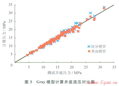 從統(tǒng)計(jì)誤差看,Gray模型各項(xiàng)最小(3),組分模型計(jì)算誤差略大于黑油模型。這是由于Gray模型的持液率計(jì)算過(guò)程中考慮了凝析油的反凝析現(xiàn)象,而組分模型再引入相態(tài)方程,使凝析現(xiàn)象疊加導(dǎo)致組分模型計(jì)算壓力較黑油模型對(duì)中性略差,誤差增加。此推薦Gray模型按黑油模型計(jì)算凝析氣井井筒壓力。