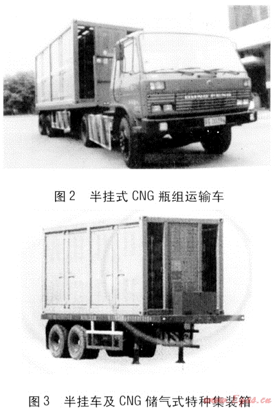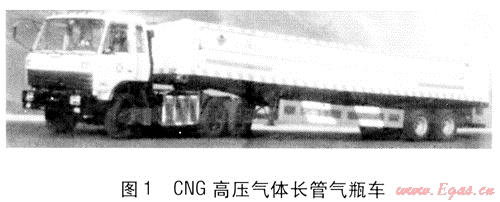 ① CNG高壓氣體長管氣瓶車(見圖1)由牽引車、高壓管道、半掛車(包括底盤、瓶組、安全倉、操作倉)等組成。高壓管道集裝箱的外部幾何尺寸符合國際標準12.2m(40英尺)集裝箱的要求,在充裝壓力達20MPa時可儲存CNG量4450m3。CNG高壓氣體長管氣瓶車適用于運輸?shù)缆穼掗?,路面質量好的情況,一次性運輸量較多,可降低運輸成本。但它對運輸?shù)缆酚幸?,車輛的價格較高,在我國北方路況較好的地區(qū)使用較多。