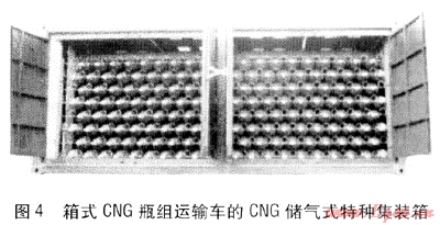 ③ 箱式CNG瓶組運輸車由箱式貨車、CNG儲氣式特種集裝箱(見圖4)組成。