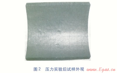 壓力實(shí)驗后試樣外觀見圖2。比較圖1、2可知,壓力實(shí)驗前后涂層顏色未出現(xiàn)明顯變化,涂層表面光滑平整,無起泡、針孔、裂紋等現(xiàn)象,也未腫脹及變軟。涂層與基材之間未脫落,附著情況良好。