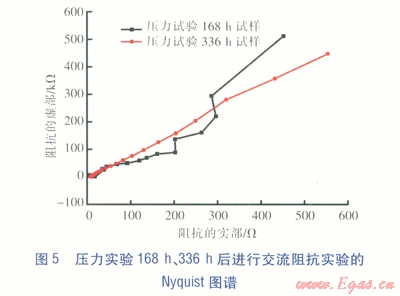 實(shí)驗?zāi)康氖菧y試涂層對基材的保護(hù)能力。交流阻抗實(shí)驗選用的儀器為電化學(xué)測試用PARSTAT2273電化學(xué)工作站,采用經(jīng)典一三電極體系:參比電極為飽和甘汞電極(SCE),輔助電極為鉑電極,帶涂層的基材為工作電極。分別對實(shí)驗時間為1h2h、168h、336h的壓力實(shí)驗試件進(jìn)行交流阻抗實(shí)驗[3],實(shí)驗數(shù)據(jù)采用ZsimpWin軟件擬合,并擬合出Nyquist圖譜(見圖45)。圖45并未出現(xiàn)文獻(xiàn)[4]提供的曲線形態(tài)(該曲線形態(tài)表征腐蝕物穿透涂層,對基材造成損害)可得到以下結(jié)論:涂層有效阻擋了天然氣腐蝕性物質(zhì)向基材的擴(kuò)散。