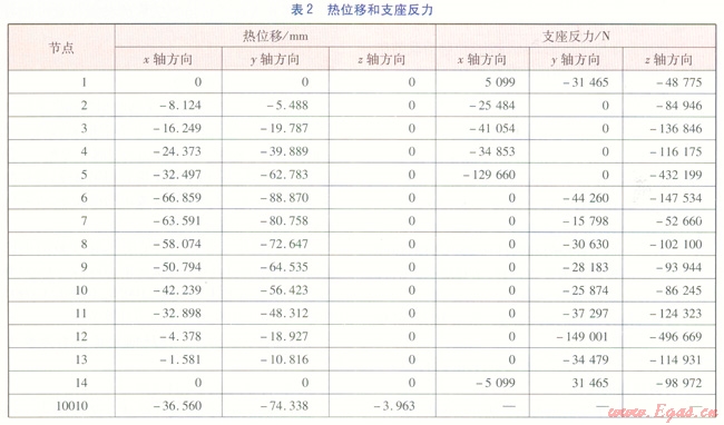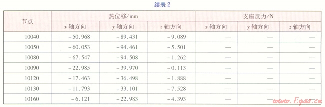 輸入數據:熱水溫度130℃,設計壓力1.6MPa,管材Q2358,管道外直徑1220mm,直管壁厚16mm,彎頭壁厚18mm。其他參數可通過AutoPSA應力分析軟件,實現手動調用或自動調用。建立好的計算模型經AutoPSA應力分析軟件分析計算,得到一次應力、二次應力、熱位移、支座反力。應力驗算結果見表1,熱位移、支座反力見表2。由表1可知,供熱管道各單元的一次應力、二次應力均滿足《規(guī)范》要求。表2數據可作為結構專業(yè)設計桁架的基礎數據,表中負號表示方向與坐標軸正向相反。