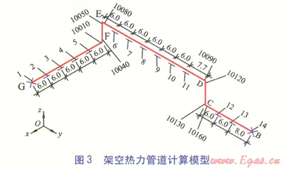 架空供熱管道計算模型見圖3,圖中數值單位為m。其中節(jié)點1、14為固定支架,節(jié)點2~13為滑動支架,節(jié)點l0010、10040、10050、10080、10090、10120、10130、10160為彎頭應力計算節(jié)點。