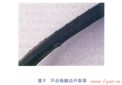 合格的判定:翻邊不開(kāi)裂,或者即使開(kāi)裂,開(kāi)裂面是韌性開(kāi)裂面(見(jiàn)圖7),判定為合格;翻邊發(fā)生開(kāi)裂,并且開(kāi)裂面是光滑平整的脆性開(kāi)裂面(見(jiàn)圖8),判定為不合格。對(duì)于判定不合格的接頭需割除接頭重新焊接,如果不合格的數(shù)量較多,但翻邊脆性開(kāi)裂長(zhǎng)度小于25%,則應(yīng)該通過(guò)選取典型試件做拉伸性能試驗(yàn)來(lái)最終確定該類焊接接頭是否合格。