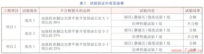 表2中,耐壓(靜液壓)強(qiáng)度試驗(yàn)合格,即焊接處無(wú)破壞,無(wú)滲漏;拉伸性能試驗(yàn)不合格,指焊接接頭破壞類型為脆性開(kāi)裂(見(jiàn)圖4);拉伸性能試驗(yàn)合格,則焊接接頭破壞類型為韌性開(kāi)裂(見(jiàn)圖5)。
