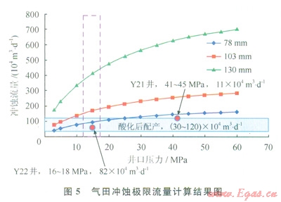 在氣田生產(chǎn)過程中,為了進(jìn)一步分析產(chǎn)量過高的原因產(chǎn)生的沖蝕,開展了不同單井井口壓力和產(chǎn)量下的臨界沖蝕流量的計(jì)算。根據(jù)氣田的具體情況,井口設(shè)備的節(jié)流閥通徑分別為78mm、103mm、130mm。因此,分別計(jì)算了氣田工況范圍下的單井極限沖蝕流量。根據(jù)計(jì)算結(jié)果可以看到,將2口典型井在試氣時(shí)的工況標(biāo)在計(jì)算圖(圖4)中,2口井均在沖蝕流量之下(圖5)。在氣田生產(chǎn)中,根據(jù)開發(fā)配產(chǎn),建議井口產(chǎn)氣量限制在70×104~95×104m3/d,少數(shù)井配產(chǎn)在100×104m3/d或以上時(shí),井口閥的尺寸要求換成100.5mm。由此確定井口采氣樹選擇如下:產(chǎn)量小于80×104m3/d,主通徑(標(biāo)稱尺寸)為78mm;產(chǎn)量在80×104~200×104m3/d,主通徑為103mm;產(chǎn)量大于200×104m3/d,主通徑為130mm。
