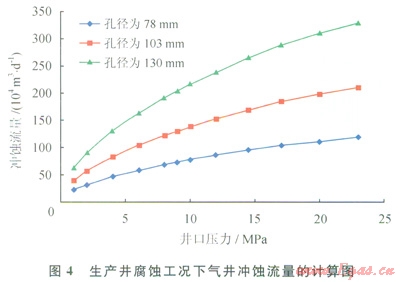 計(jì)算了不同井口壓力下不同孔徑尺寸(標(biāo)稱尺寸,最小內(nèi)徑)沖蝕流量(圖4),計(jì)算的生產(chǎn)工況范圍按照氣田的實(shí)際情況確定。根據(jù)計(jì)算,油壓為15~18MPa,井口溫度為60~70℃,Æ78mm節(jié)流閥抗沖蝕流量為85×104~112×104m3/d。氣田的產(chǎn)量最高達(dá)126×104m3/d,一般井產(chǎn)量均大于85×104m3/d。因此,生產(chǎn)過程中長期存在沖蝕現(xiàn)象,這是井口腐蝕嚴(yán)重的重要原因之一。根據(jù)計(jì)算結(jié)果,在目前的工況下,為避免沖蝕和安全生產(chǎn),一些單井產(chǎn)量最好控制在85×104m3/d以下。