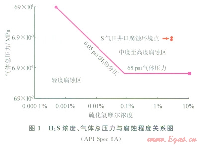 根據(jù)NACE標(biāo)準(zhǔn)H2S和CO2分壓與腐蝕程度關(guān)系(圖1),如果H2S氣體的分壓大于0.34474kPa(0.05psi絕對壓力,1psi=6.895kPa,下同),則必須使用抗硫化氫材料。根據(jù)腐蝕環(huán)境分析,氣田位于中至高度腐蝕區(qū)。氣田CO2分壓與H2S分壓之比小于200,系統(tǒng)腐蝕以H2S為主導(dǎo)。