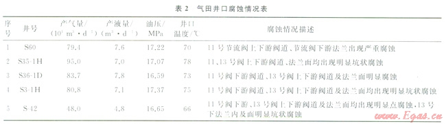 氣田正在生產(chǎn)的部分典型井具體情況見表2。井的產(chǎn)氣量從48×104~95×104m3/d,油壓為16~18MPa,井口溫度為66~78℃。腐蝕情況的主要表現(xiàn)為節(jié)流閥上下游閥道、法蘭面均出現(xiàn)明顯坑狀腐蝕。地層主要是碳酸鹽巖,生產(chǎn)過程中沒有出現(xiàn)井口固體砂粒的現(xiàn)象。從腐蝕情況來看,并不是僅有高產(chǎn)井出現(xiàn)了井口腐蝕。分析腐蝕的發(fā)生不僅與產(chǎn)量有關(guān),顯然也與溫度和壓力有一定的關(guān)系,處于經(jīng)濟(jì)考慮而選擇的節(jié)流閥材質(zhì)偏低也是原因之一。在氣田進(jìn)行完井生產(chǎn)管柱設(shè)計(jì)時(shí),對油管進(jìn)行了沖蝕極限速度的校核,選擇了Æ88.9mm為主的生產(chǎn)油管。但是井口的部分節(jié)流閥尺寸小于油管尺寸,對沖蝕腐蝕沒有進(jìn)行重點(diǎn)研究。由此推斷,腐蝕的主要因素不僅是化學(xué)腐蝕,更有可能來源于沖蝕腐蝕。因此,進(jìn)行沖蝕極限速度的計(jì)算來判定腐蝕是必要的。