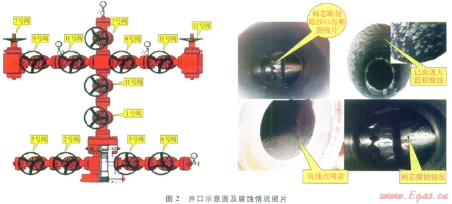 1)阿姆河酸性氣田高含硫化氫和二氧化碳,單井產(chǎn)能高。氣田屬于中一嚴(yán)重腐蝕環(huán)境,井口設(shè)備在生產(chǎn)過程中出現(xiàn)了不同程度腐蝕,出現(xiàn)腐蝕的井口位置基本相似,主要表現(xiàn)為坑蝕、點(diǎn)蝕,伴有閥芯斷裂的情況,在一定程度上影響了正常生產(chǎn)。腐蝕主要來源于酸性環(huán)境下的沖蝕腐蝕。