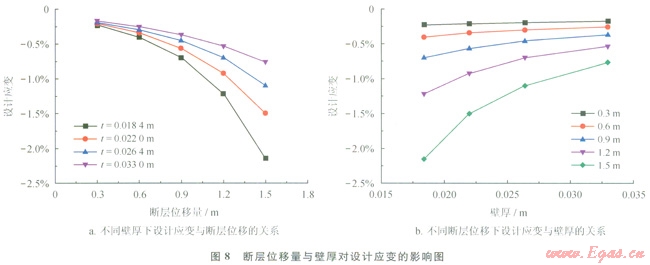圖7、8給出了不同斷層錯(cuò)動(dòng)位移下管徑和壁厚對(duì)設(shè)計(jì)應(yīng)變的影響。從圖7-a和圖8-a可以看出,管徑和壁厚越大,設(shè)計(jì)應(yīng)變?cè)叫?,但在不同的管徑和壁厚下設(shè)計(jì)應(yīng)變和斷層錯(cuò)動(dòng)量都保持著相似的函數(shù)關(guān)系。圖7-b和圖8-b給出了不同斷層位移下設(shè)計(jì)應(yīng)變與管徑和壁厚的變化規(guī)律,可以看出,設(shè)計(jì)應(yīng)變隨管徑和壁厚的變化規(guī)律比較一致,也可以用冪函數(shù)來(lái)描述。