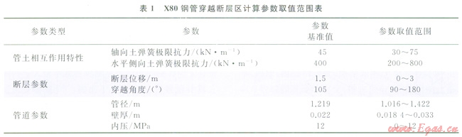 根據(jù)“西氣東輸二線”工程管道的實(shí)際運(yùn)行參數(shù)與沿途斷層參數(shù),對(duì)模型計(jì)算參數(shù)進(jìn)行取值,得到的模型計(jì)算參數(shù)范圍如表1所示。這里需要說(shuō)明的是,直接研究斷層對(duì)管道在空間中造成的錯(cuò)動(dòng)雖然更加符合實(shí)際,但該情況下影響參數(shù)眾多,很難得到設(shè)計(jì)應(yīng)變與各影響參數(shù)間的準(zhǔn)確關(guān)系與回歸公式。所以筆者只討論管道錯(cuò)動(dòng)分解后位于水平面內(nèi)的情況。當(dāng)分析管道在水平面內(nèi)錯(cuò)動(dòng)時(shí),垂直向上與向下的土彈簧對(duì)管道的應(yīng)變不再產(chǎn)生任何影響,所以可以不用考慮。而管道的軸向土彈簧與側(cè)向土彈簧的取值范圍由“西氣東輸二線”中出現(xiàn)的管道埋深、回填土和場(chǎng)地土性質(zhì)參考ASCE Guidelines for the Design 0/Buried Steel Pipe方法進(jìn)行計(jì)算確定。可以得到各參數(shù)取值范圍如表1所示。