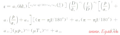 基于有限元分析結(jié)果,給出了穿越角度大于90°時(shí)跨斷層區(qū)X80鋼管設(shè)計(jì)應(yīng)變的回歸公式。根據(jù)參數(shù)分析得到的各參數(shù)對(duì)設(shè)計(jì)應(yīng)變的影響規(guī)律可以得到設(shè)計(jì)應(yīng)變的回歸公式形式如下: