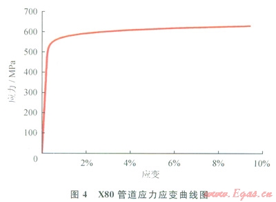式中E為管材的初始彈性模量;e為應(yīng)變;s為應(yīng)力;ss為管材的屈服應(yīng)力;a和N為R-O模型參數(shù)。對(duì)X80鋼管材拉伸實(shí)驗(yàn)結(jié)果的真實(shí)應(yīng)力應(yīng)變曲線下限值進(jìn)行擬合[10],得到參數(shù)取值如下:E=206000MPa;ss=2552MPa;a=0.86;N=28。管道真實(shí)應(yīng)力應(yīng)變關(guān)系如圖4所示。