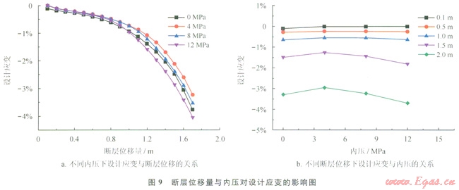 考慮0MPa、4MPa、8MPa、12MPa這4種不同內(nèi)壓工況下設(shè)計(jì)應(yīng)變的變化規(guī)律。由有限元結(jié)果可以得到,設(shè)計(jì)應(yīng)變?cè)诓煌瑑?nèi)壓下隨斷層位移的變化規(guī)律比較類似(圖9)。為了進(jìn)一步分析內(nèi)壓對(duì)設(shè)計(jì)應(yīng)變的影響,分析了不同斷層位移下設(shè)計(jì)應(yīng)變隨內(nèi)壓的變化情況。從圖9-b可以看出,當(dāng)斷層位移量大于1m時(shí),設(shè)計(jì)應(yīng)變?cè)?/span>4MPa時(shí)應(yīng)變最?。划?dāng)斷層位移量小于1m時(shí),設(shè)計(jì)應(yīng)變較小,不同內(nèi)壓下設(shè)計(jì)應(yīng)變的差距變得不大明顯。