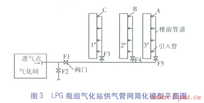 為便于論述,將LPG瓶組氣化站供氣管網(wǎng)進(jìn)行簡化,簡化模型見圖3,假設(shè)供氣小區(qū)有3棟樓(1#、2#、3#),每棟樓有4個單元。以簡化模型為例,對置換的原則、順序進(jìn)行探討。