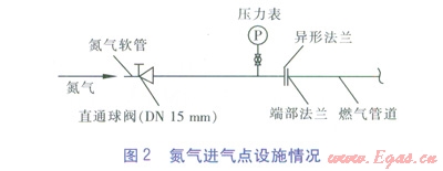 ②現(xiàn)場準(zhǔn)備:核實現(xiàn)場的管道、閥門位置,通過開關(guān)閥門,了解每個閥門是否有效,清楚閥門是否有內(nèi)漏情況(通過閥門開關(guān)及管段壓力變化試驗來確定)。對于關(guān)鍵閥門,如發(fā)現(xiàn)內(nèi)漏或失效情況,要在停氣后更換,為之后的置換做準(zhǔn)備。停氣后將氮?dú)膺M(jìn)氣點(diǎn)設(shè)施按要求安裝。