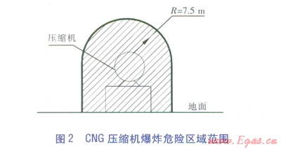 查看規(guī)范GB 50156—2012附錄C爆炸危險區(qū)域圖,露天設置的CNG儲氣瓶組、CNG壓縮機的爆炸危險區(qū)域范圍見圖1、2,圖中陰影部分表示爆炸危險區(qū)域(2區(qū))。