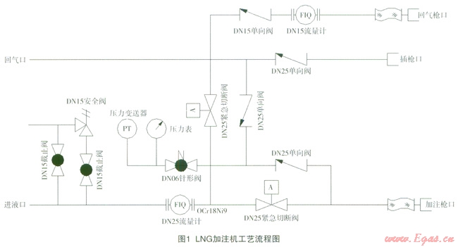 現(xiàn)代化的液化天然氣(LNG)加注機(jī)設(shè)備一般由電控系統(tǒng)、質(zhì)量流量計(jì)、管路系統(tǒng)3部分組成。LNG加注機(jī)具有新穎的人機(jī)操作界面、可靠的IC卡收費(fèi)及結(jié)算等先進(jìn)功能,以及有關(guān)網(wǎng)絡(luò)化管理的標(biāo)準(zhǔn)接口。在電氣控制上都采用了防爆結(jié)構(gòu),符合國(guó)家防爆檢驗(yàn)機(jī)關(guān)的相關(guān)要求。