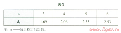 式中,Emax和Emin分別為規(guī)定測(cè)量點(diǎn)下,示值相對(duì)誤差的最大值和最小值,dn為極差系數(shù),見(jiàn)表3。