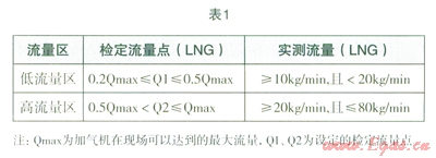 根據(jù)加氣機(jī)工作流程,按照加氣機(jī)在現(xiàn)場(chǎng)可以達(dá)到的最大流量Qmax分為兩個(gè)流量區(qū),其檢定流量區(qū)(LNG)Q1、Q2的設(shè)定以及實(shí)測(cè)流量(LNG)見(jiàn)表l的要求。表2為加氣機(jī)準(zhǔn)確度等級(jí)及對(duì)應(yīng)的最大允許的誤差。