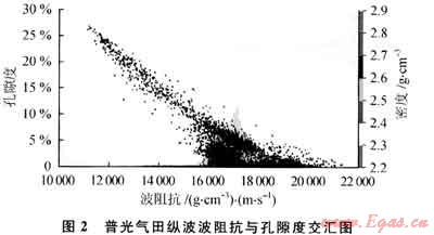 地震資料的優(yōu)勢在于能夠提供遠(yuǎn)離井點(diǎn)的儲(chǔ)集層信息.但該數(shù)據(jù)體是否能用于約束儲(chǔ)集層參數(shù)建模,還需要進(jìn)一步分析其與儲(chǔ)集層物性參數(shù)的相關(guān)性,只有兩者相關(guān)性好,方可用地震資料反演約束建模。選擇何種地震屬性作為約束條件,以及利用地震數(shù)據(jù)體對(duì)何種儲(chǔ)層參數(shù)做約束是這種建模方法中很重要的一個(gè)環(huán)節(jié)。通過分析認(rèn)為,孔隙度曲線與地震反演波阻抗之間存在良好的負(fù)相關(guān)(圖2),即高孔隙度層段通常都對(duì)應(yīng)于低波阻抗反射波,而低孔隙度層對(duì)應(yīng)于高波阻抗。