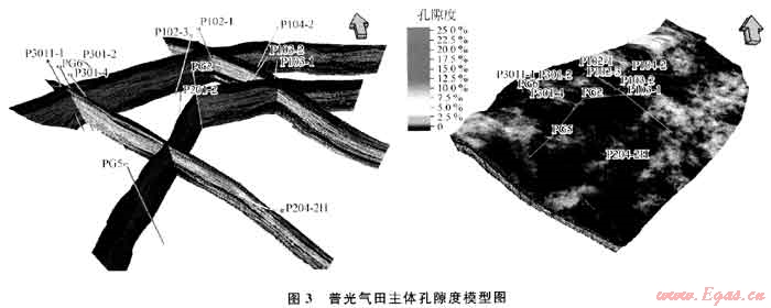 普光地區(qū)儲(chǔ)層屬于碳酸鹽巖礁灘相沉積,針對(duì)儲(chǔ)層儲(chǔ)集空間的類型多樣,儲(chǔ)層厚度大、非均質(zhì)性較強(qiáng),存在多套氣水關(guān)系等地質(zhì)特點(diǎn),綜合利用地震、測井及地質(zhì)等資料,在對(duì)儲(chǔ)層主控因素分析的基礎(chǔ)上,根據(jù)確定性建模與隨機(jī)建模相結(jié)合的原則、等時(shí)建模原則、地震數(shù)據(jù)約束建模原則,利用序貫高斯模擬法、克里金模擬法,對(duì)儲(chǔ)層物性空間分布的非均質(zhì)性進(jìn)行了細(xì)致的描述,建立普光氣田主體構(gòu)造儲(chǔ)層模型。