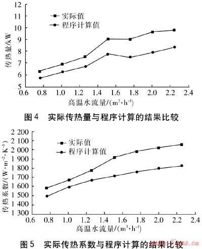 實際傳熱量、傳熱系數(shù)與程序計算的結(jié)果比較分別見圖4、5。結(jié)果表明,實際值與程序計算值的最大相對誤差為12%,并且保留了一定的設(shè)計余量,因此這里所述的液-液熱管換熱器的設(shè)計計算方法具有很高的可靠性。
