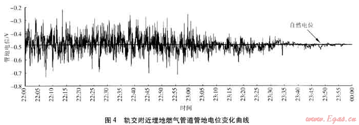 以管道未受干擾時的自然電位為基準,雜散電流流入?yún)^(qū),管地電位負向偏移,管道處于陰極區(qū)受到保護;雜散電流流出區(qū),管地電位正向偏移,管道為陽極區(qū)發(fā)生腐蝕,必須采取防護措施。對于動態(tài)雜散電流干擾,管道陰極區(qū)和陽極區(qū)分布是動態(tài)變化的,管道某點可能處于雜散電流流入、流出交替變化中,為管道雜散電流腐蝕判定及防護帶來一定的困難。對上海市某軌道交通旁的埋地燃氣管道管地電位進行實時監(jiān)測,變化如圖4,測試過程中將犧牲陽極斷開,以軌交停運后管地電位平均值作為自然電位。在軌交運行期間多列機車通過測試點,管地電位相對自然電位正負交替變化,電位正向和負向偏移均比較明顯。