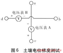 土壤電位梯度指土壤中電流流動形成的電位差,可通過沿管道方向和垂直管道方向兩組參比電極電位差矢量和求得,測試接線見圖6。4只銅/飽和硫酸銅(Cu/CuS04)參比電極a、b、c、d;ac與bd垂直對稱布置且距離相等,其中ac與管道平行且電極間距宜為100m,當受到環(huán)境限制時可適當縮短。電壓表所測得的Vac和Vbd除以電極間距,則得到與管道平行和與管道垂直方向的土壤電位梯度,其矢量和即為該點的土壤電位梯度。土壤電位梯度的大小可判定雜散電流大小,電位梯度方向與雜散電流方向相同。