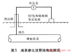 土壤和管道中有電流流過時總會引起電位的變化,通過管地電位偏移可以對雜散電流影響進行判定。管地電位指埋地燃氣管道與對應參比電極之間的電位差。根據(jù)參比電極位置不同有直接參比法、地表參比法、近參比法、遠參比法等。地表參比法管地電位測試接線見圖5。對于管地電位波動頻繁地區(qū),可采用電子記錄儀表代替?zhèn)鹘y(tǒng)電壓表,引申為管地電位連續(xù)監(jiān)測法。