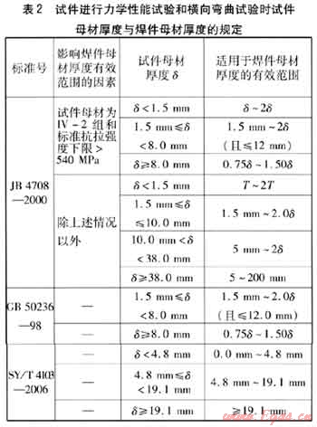試件進行力學性能試驗和橫向彎曲試驗時試件厚度與焊件母材厚度的規(guī)定見表2。