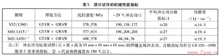 燃氣調(diào)壓裝置制造公司可根據(jù)自身特點,選用國內(nèi)焊接材料,在管線鋼的焊接中采用SMAW+GMAW和GTAW+GMAW,焊后試件各項機械性能指標均達到規(guī)范要求。焊材和部分試件機械性能指標見表4、5。