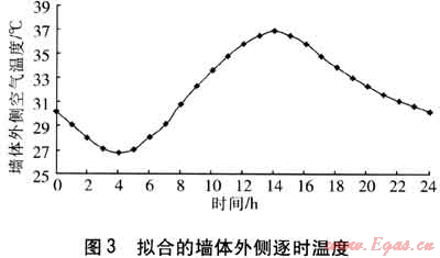 b. 墻體外側(cè)空氣溫度呈簡(jiǎn)諧波規(guī)律變化,本文選取武漢作為夏熱冬冷地區(qū)的典型城市進(jìn)行分析,利用武漢夏季某典型日的室外空氣溫度[15]。進(jìn)行計(jì)算,擬合的墻體外側(cè)逐時(shí)溫度見(jiàn)圖3。