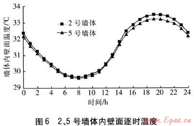 對(duì)比不同厚度絕熱材料的外保溫墻體。2號(hào)墻體采用30mm厚EPS板作為絕熱材料,5號(hào)墻體采用50mm厚EPS板作為絕熱材料。2、5號(hào)墻體的衰減度分別為35.68、47.26。在同一溫度波的連續(xù)作用下,2、5號(hào)墻體內(nèi)壁面逐時(shí)溫度見(jiàn)圖6。由圖6可知,5號(hào)墻體的內(nèi)壁面溫度波動(dòng)范圍小于2號(hào)墻體,且前者內(nèi)壁面溫度低于后者。因此衰減度大的墻體內(nèi)壁面溫度更低,熱穩(wěn)定性更好。但2號(hào)與5號(hào)墻體內(nèi)壁面溫度差別不大,因此隨著絕熱材料厚度的增加,絕熱效果改善不明顯。