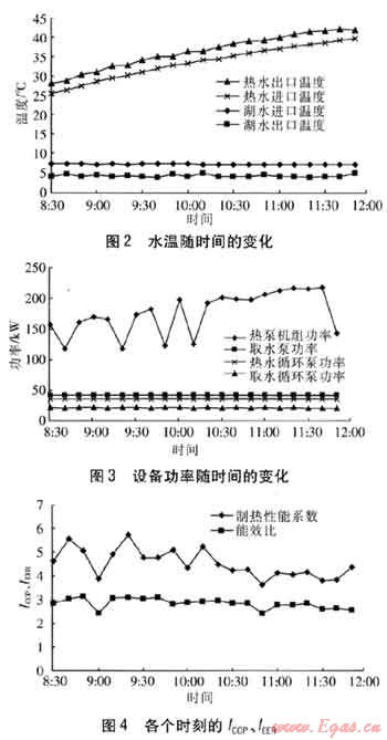 測試時(shí)間為2011年1月12日至14日,每天8:30—11:50,測試時(shí)間間隔為10min,確定系統(tǒng)運(yùn)行基本穩(wěn)定后進(jìn)行測試。測試數(shù)據(jù)包括:熱泵機(jī)組功率、熱水循環(huán)泵功率、取水泵功率、取水循環(huán)泵功率、熱泵機(jī)組熱水進(jìn)出口溫度和流量、熱泵機(jī)組湖水進(jìn)出口溫度和流量。取水系統(tǒng)原設(shè)計(jì)采用變頻控制,但測試時(shí)變頻器未最終調(diào)試完成,因此取水系統(tǒng)采用定流量運(yùn)行。熱水循環(huán)系統(tǒng)也采用定流量運(yùn)行。