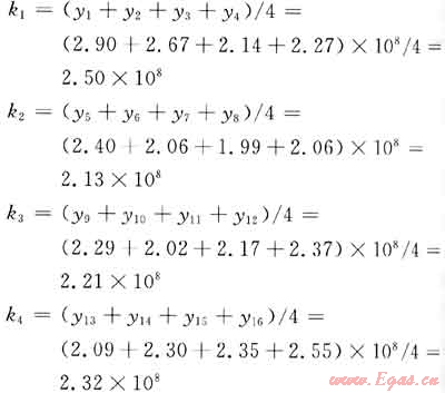 以因素管徑(d)為例,在d的1水平下有4次實驗,為1、2、3、4號實驗,將其歸為第1組。同樣,d的2水平、3水平、4水平分別歸為第2、3、4組。分別計算各組實驗的平均值,填入正交表下部相應(yīng)的位置上。如d因素各組平均值(k1、k2、k3、k4)為: