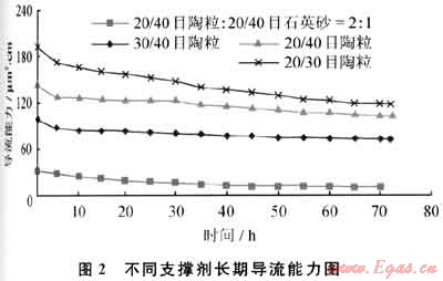 30/40目、20/40目和20/30目3種不同規(guī)格陶粒72h后導(dǎo)流能力分別為73.16μm2·cm、102.5μm2·cm和118.3μm2·cm,粒徑較大,導(dǎo)流能力較好??梢钥闯?,隨著時間的推移,粒徑增大,導(dǎo)流能力下降速度較快,但其末期導(dǎo)流能力仍高于較小粒徑支撐劑。